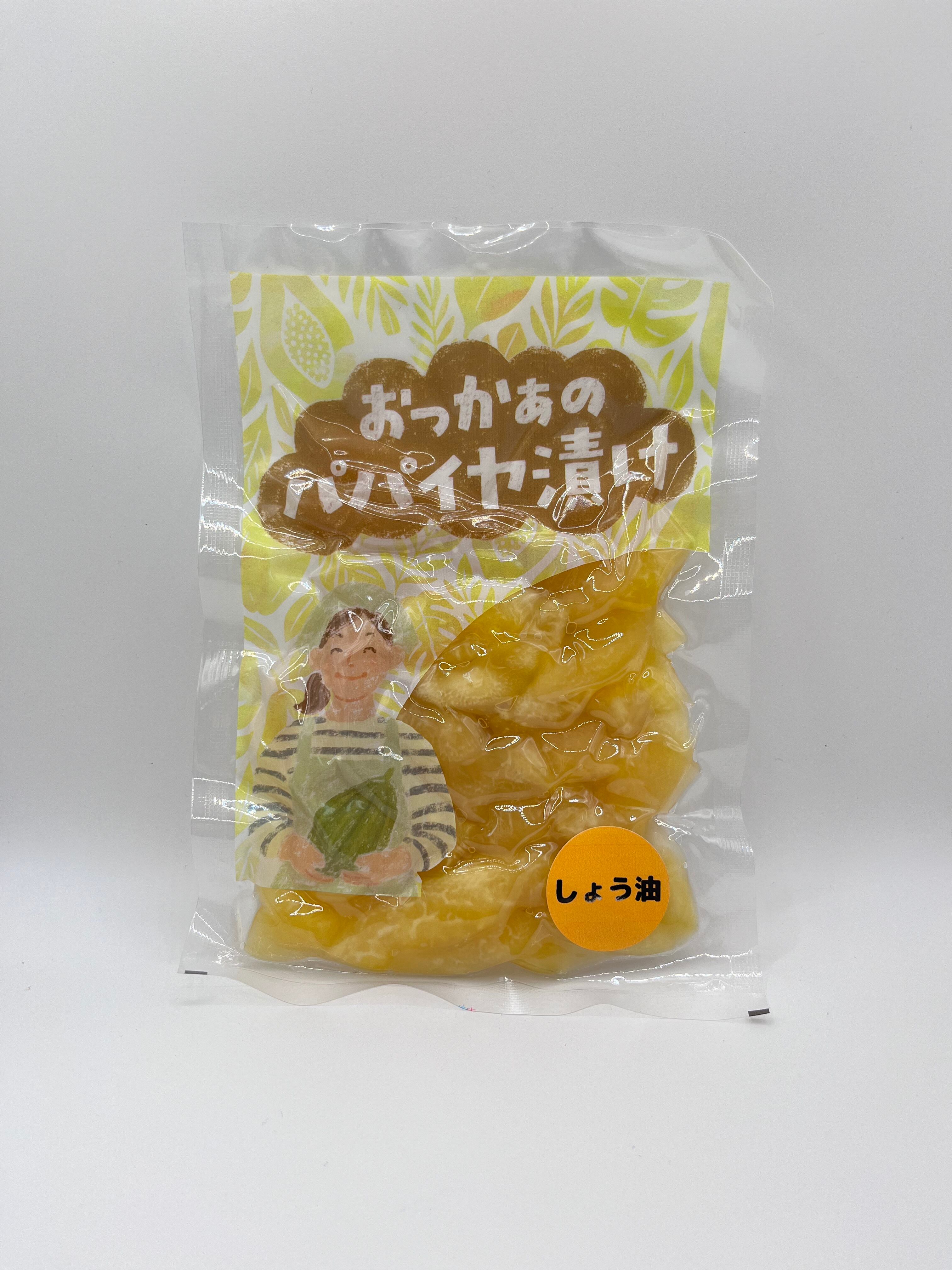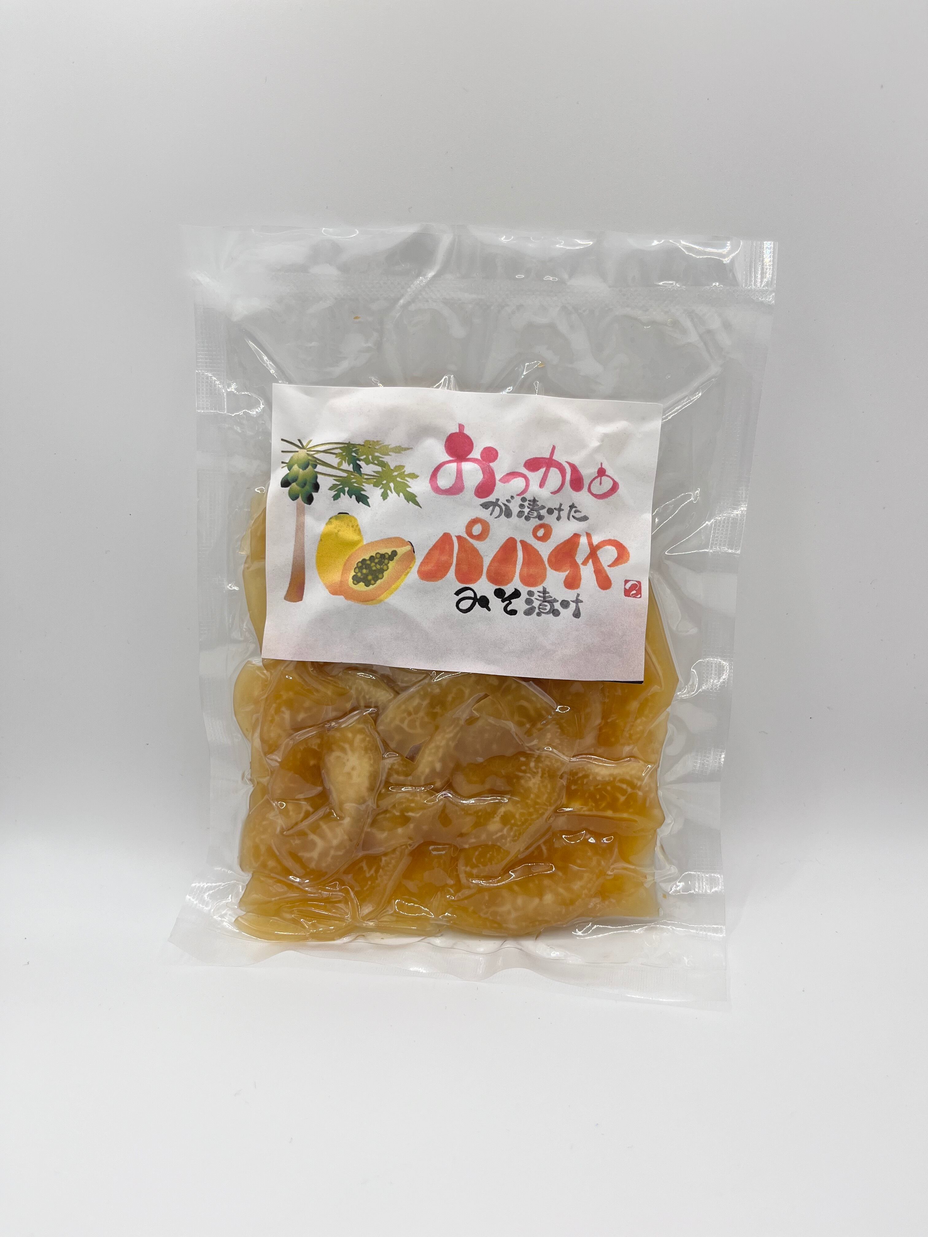 沖永良部島産のパパイヤを使用し、こだわりの醤油、味噌にじっくりと漬け込みました。パパイヤの甘みと味噌の深いコクが融合し、食卓に華やかさを添えます。お酒との相性も抜群で、晩酌のお供やご飯のおかずにぴったりです。