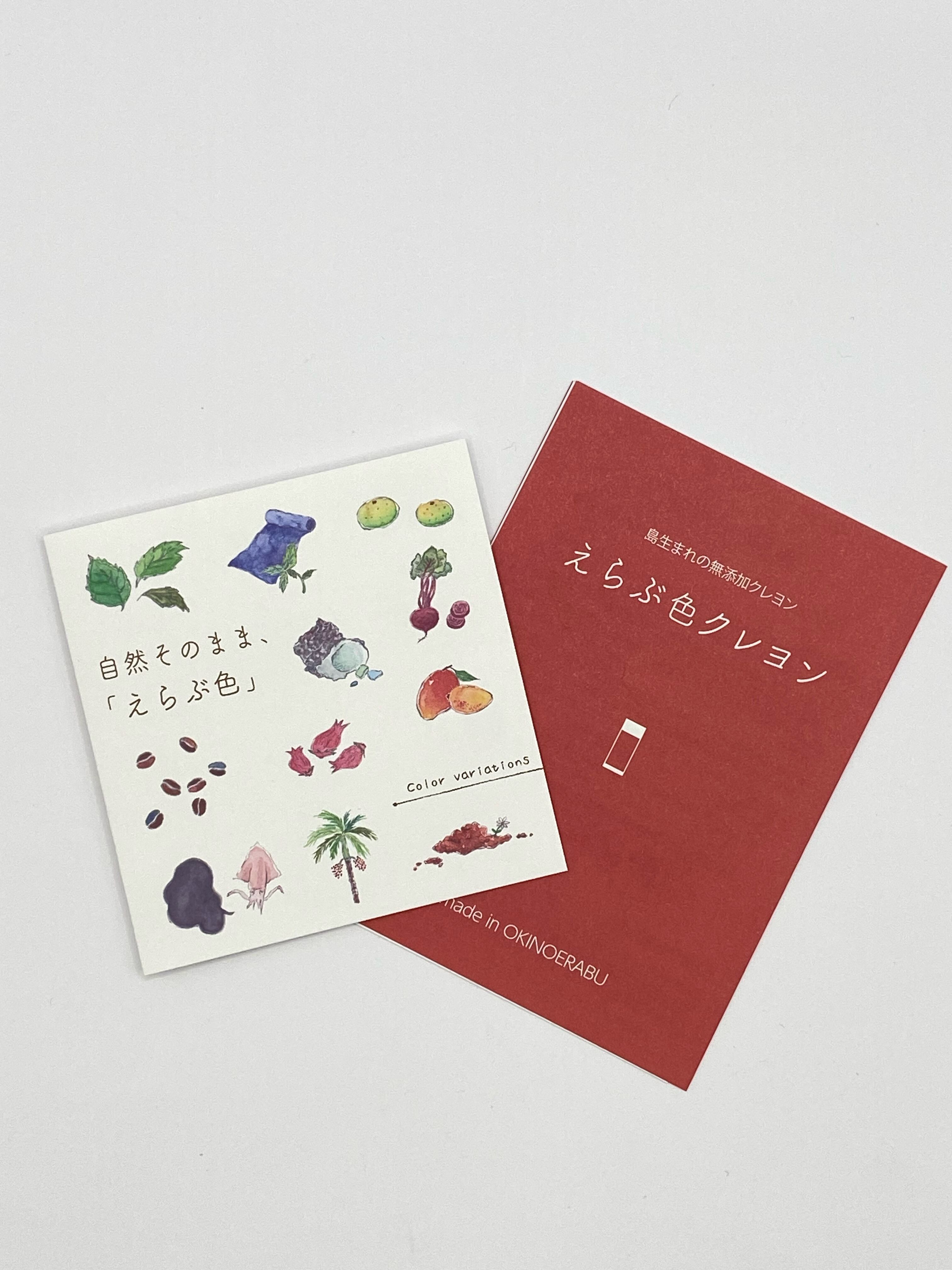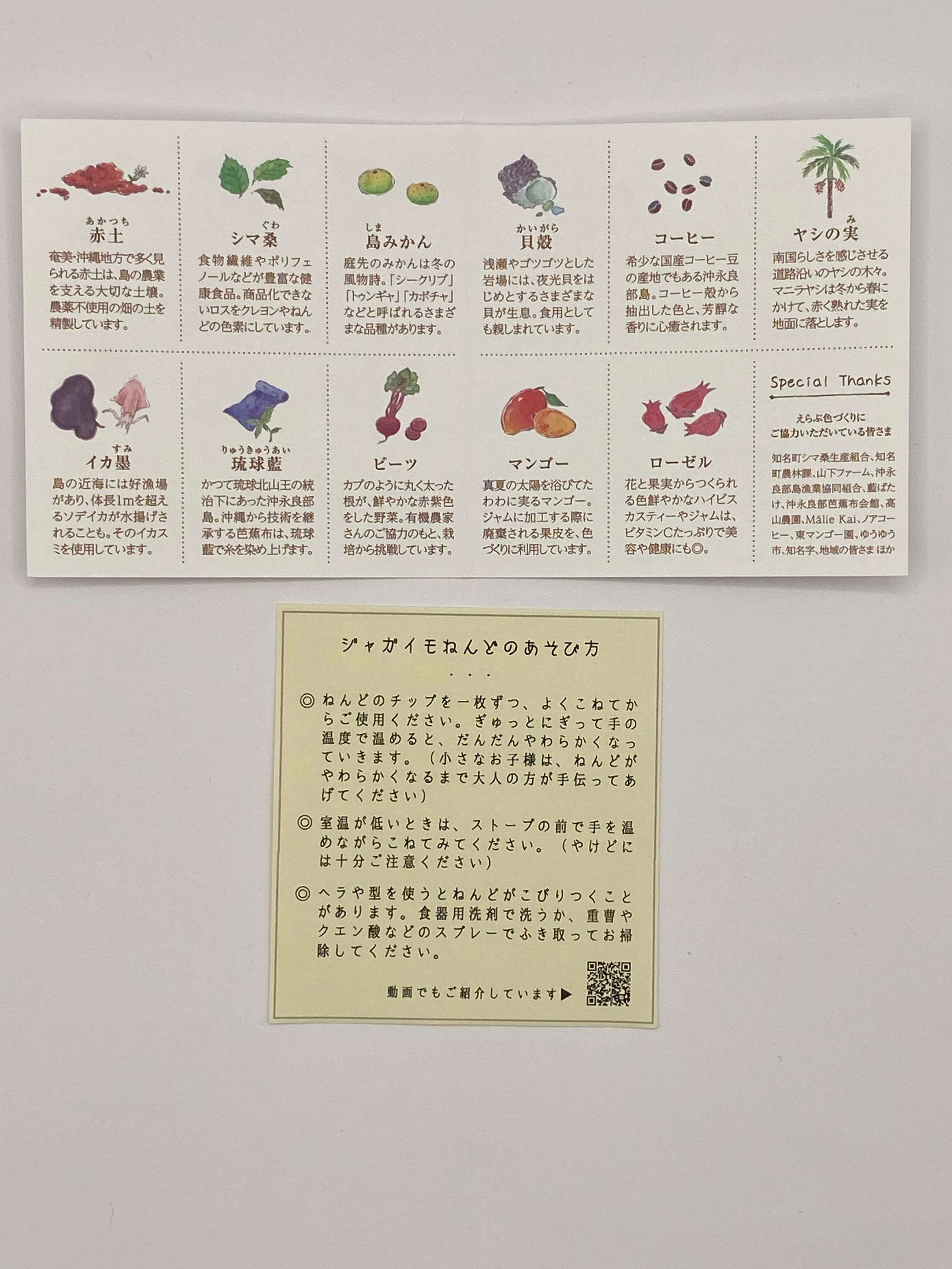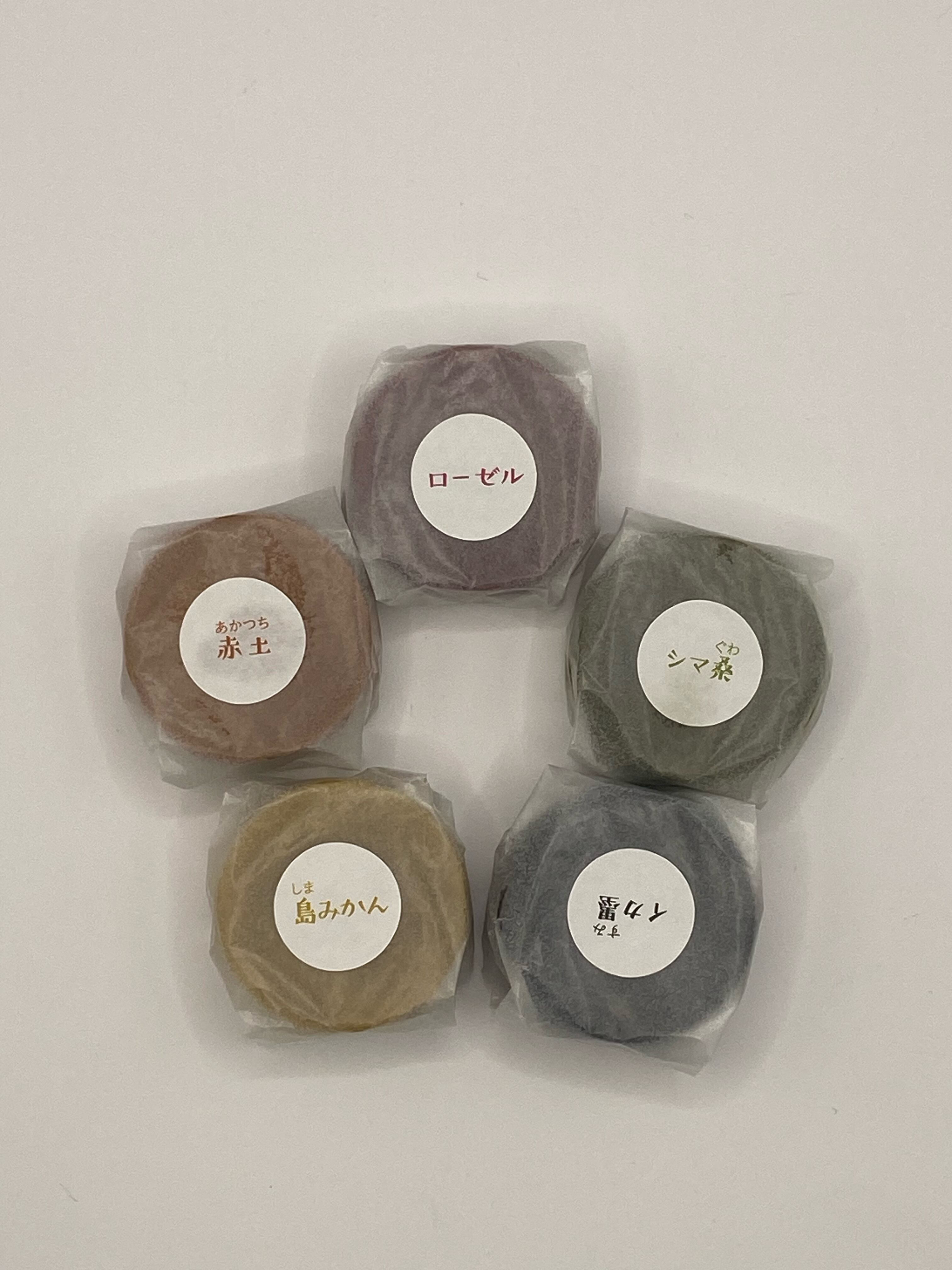 「赤土」「シマ桑」「島みかん」「イカ墨」「琉球藍」「ビーツ」「貝殻」「コーヒー」「ヤシの実」「マンゴー」「ローゼル」の11種類の中から、5色入りとなっています。(各15gずつ)