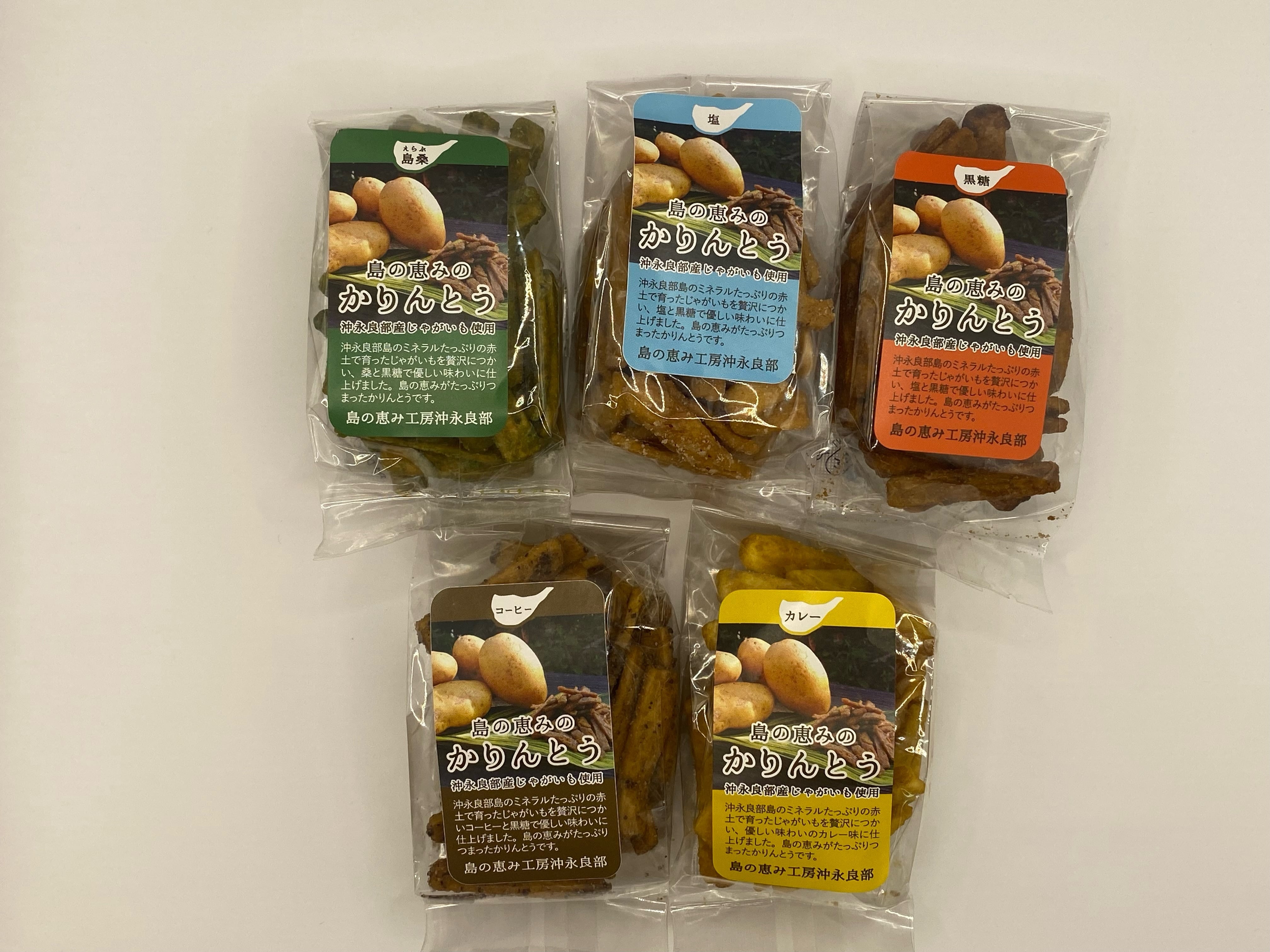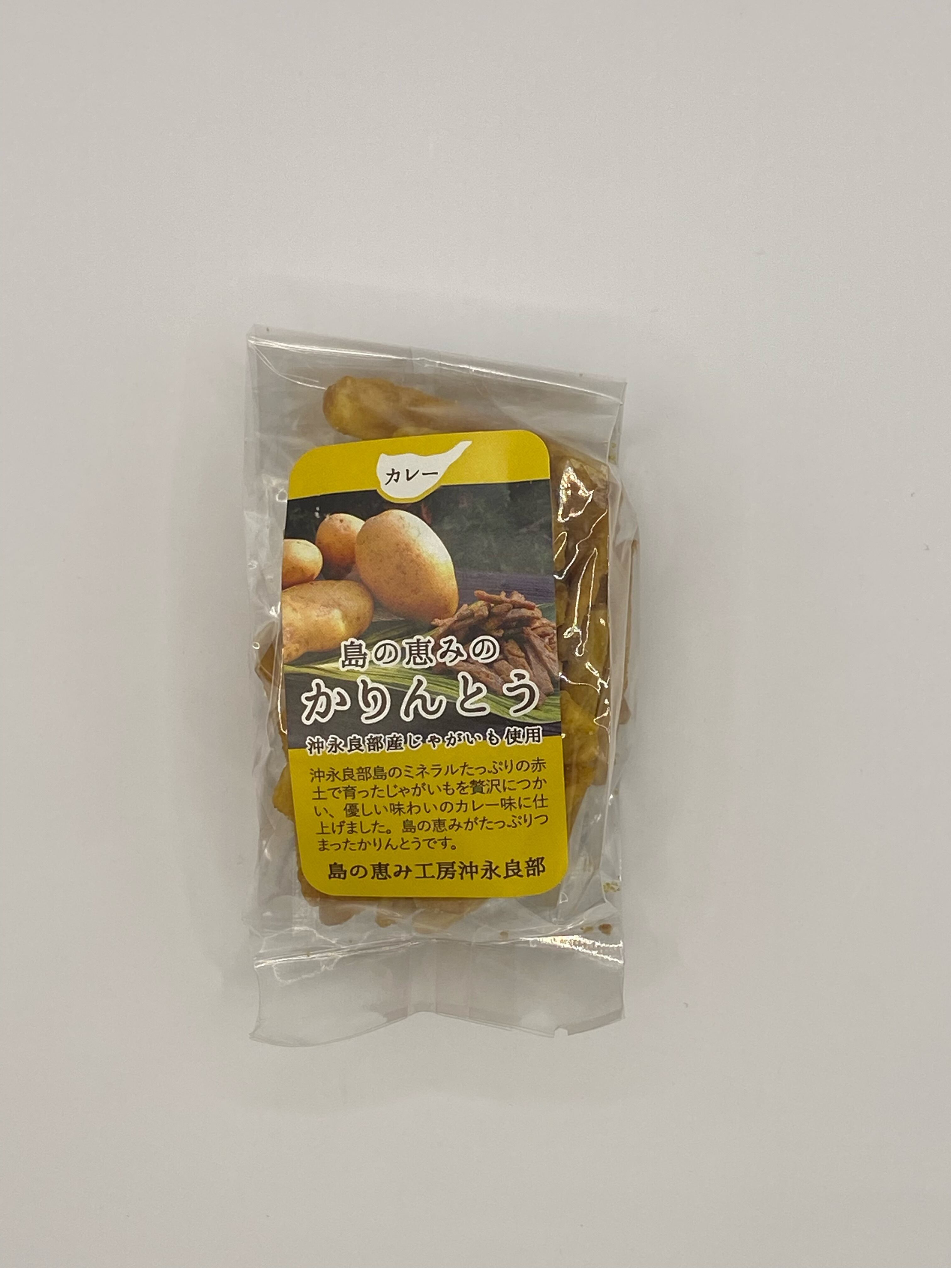 ・カレー味:小麦粉(国内製造)、ジャガイモ、砂糖、米油、乾燥おから(大豆)カレー粉、食塩(沖永良部産)/膨張剤、(一部に小麦、大豆を含む)